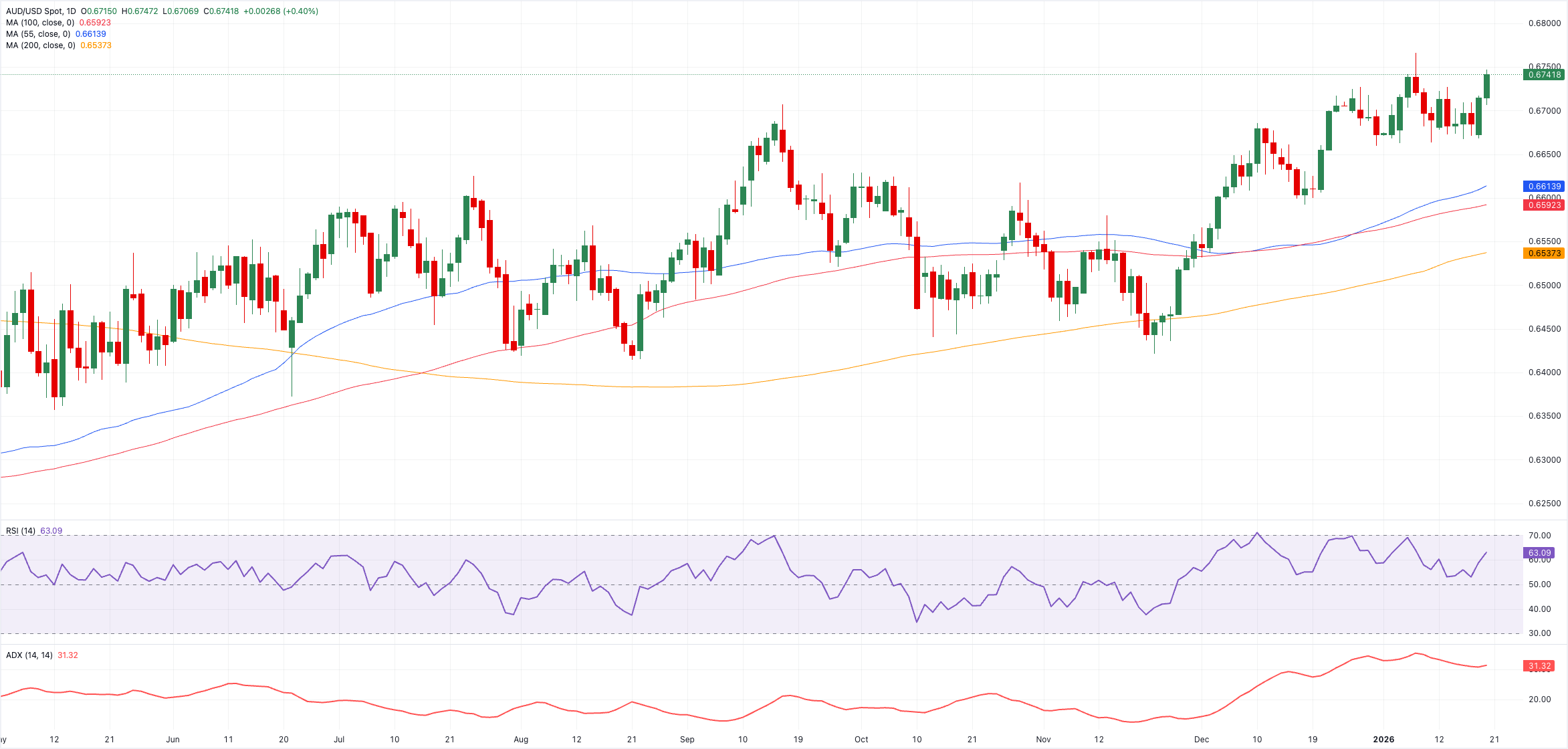 AUD/USD'nin yukarıda 0,6766 (7 Ocak) 2026 tavanıyla karşılaşması bekleniyor, ardından 0,6942 (30 Eylül) 2024 yüksekliği ve 0,7000 ölçütü geliyor.