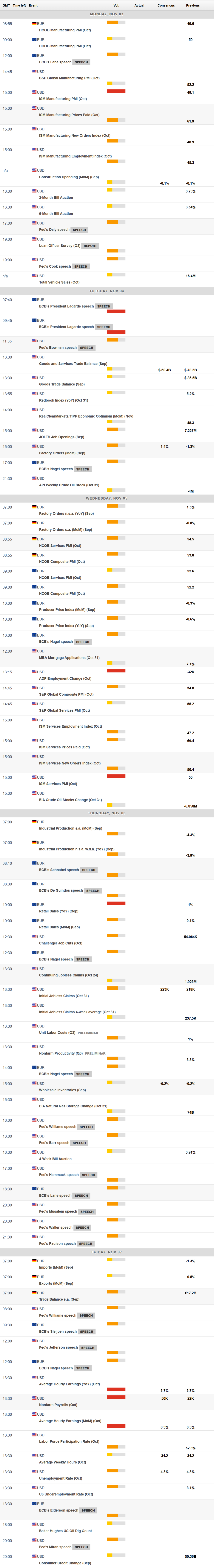 Politika yapıcılar için bir not: çok sayıda AMB ve Fed yetkilisi, para politikası açıklamalarıyla birlikte karartma döneminin sona ermesinin ardından hafta boyunca açıklamalarda bulunacak.
