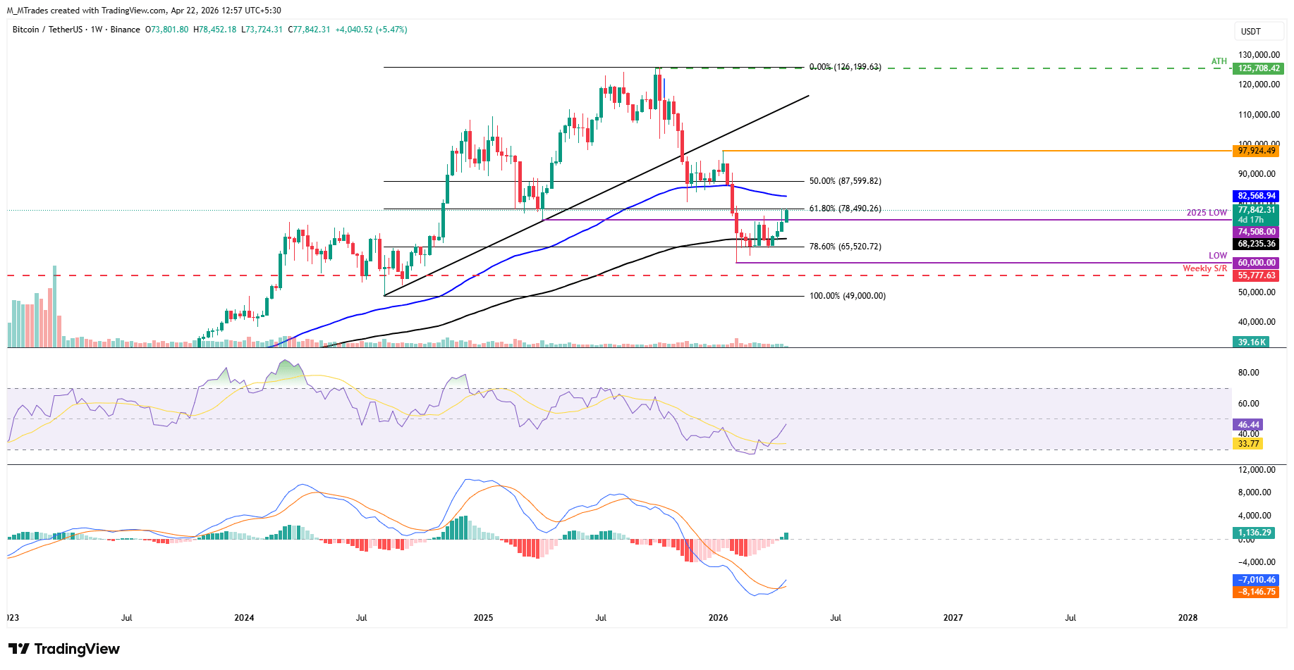 Bitcoin’in teknik görünümü de pozitif işaretler ortaya koyuyor. Kripto Kralı geçen hafta %4,33 yükselerek 11 haftanın en yüksek seviyesi olan 78.333$’a ulaştı. BTC, bu hafta %5’in üzerinde kazançla 61,8% Fibonacci düzeltme seviyesi olan 78.490$’a doğru işlem gördü (bu seviye, Ağustos 2024’deki 49.000$ dipten Ekim 2025’teki 126.199$ tüm zamanların en yüksek seviyesine çizildi).