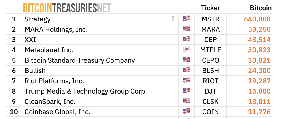 Dijital Varlık Hazineleri, Bitcoin biriktiriyor; Nasdaq'ta listelenen Strategy (MSTR) şirketi, 30 Ekim itibarıyla değeri 69,06 milyar dolar olan 640.808 BTC'ye sahip. Aynı zamanda, Marathon Holdings yaklaşık 5,73 milyar dolar değerinde 53.250 BTC'ye sahipken, Metaplanet 3,34 milyar dolar değerinde 30.823 BTC edinmiştir.