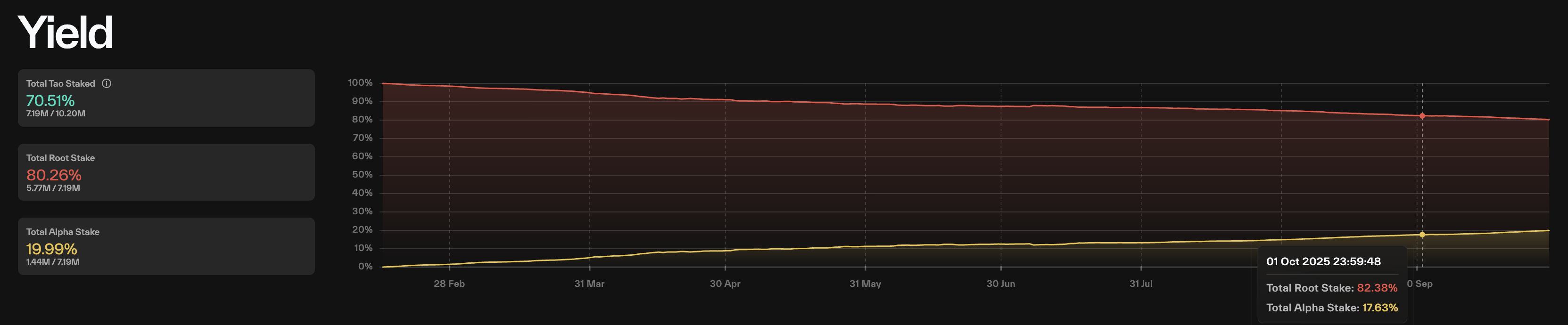 TAO'nun getirilerinin üzerinde olan alfa token'lara olan talep, kullanıcılar arasında artan risk iştahını yansıtıyor. Bu satırların yazıldığı sırada, 7,19 milyon TAO'nun %19,99'u (1,44 milyon) alfa token'lara dönüştürüldü, bu oran 1 Ekim'de %17,63'tü.