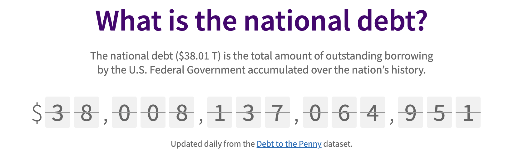 ABD Hükümeti borcu, 27 Ekim itibarıyla 38 trilyon $'a ulaştı ve bu, 2015'te 24,71 trilyon $'dan yükseldi. Eylül ayı ABD Hazine Kamu Borcu Aylık Raporu'na göre toplam borcun 30,28 trilyon $'ı kamu tarafından tutuluyor.