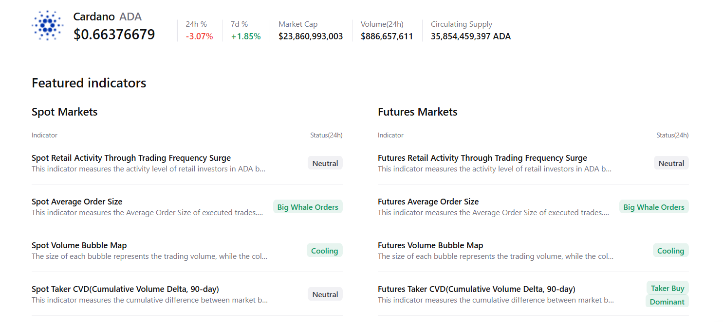 Cardano (ADA), salı günü yazıldığı sırada 0,66$ civarında işlem görüyor ve bir önceki gün kritik bir seviyeden reddedildi. On-chain veriler, balina birikiminin arttığını gösteriyor ve potansiyel bir kırılma için iyimserliği artırıyor. Teknik görünüm de, momentum göstergelerinin azalan düşüş trendini işaret etmesiyle, ileride bir ralli olasılığını destekliyor.