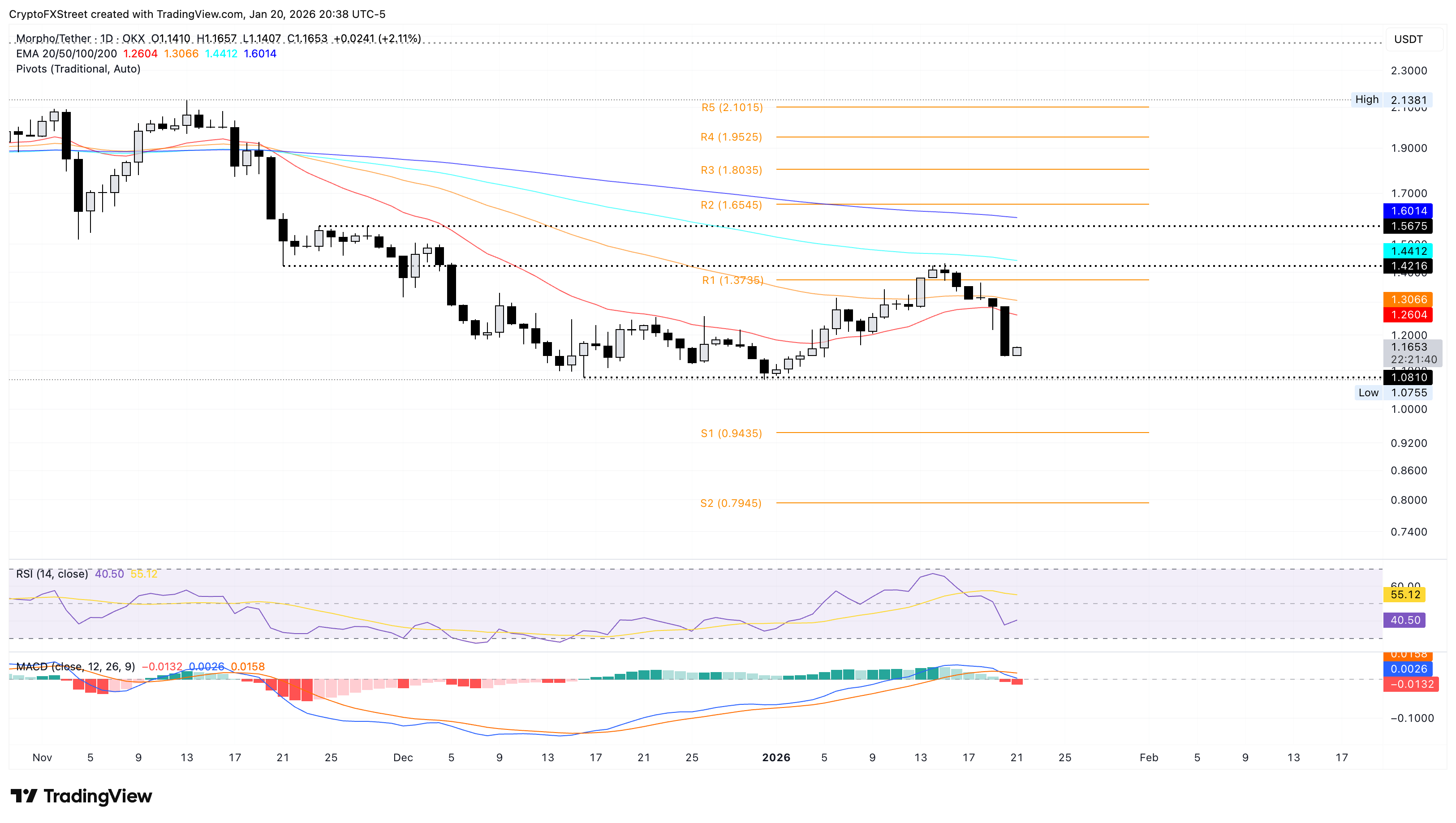 MORPHO için anlık destek, 1,08$'daki 28 Aralık düşük seviyesinde bulunuyor. Eğer bu seviyeyi aşarsa, aşağı yönlü hareket 1$ seviyesinin altına uzanabilir ve 0,94$'daki S1 Pivot Noktasını hedefleyebilir.