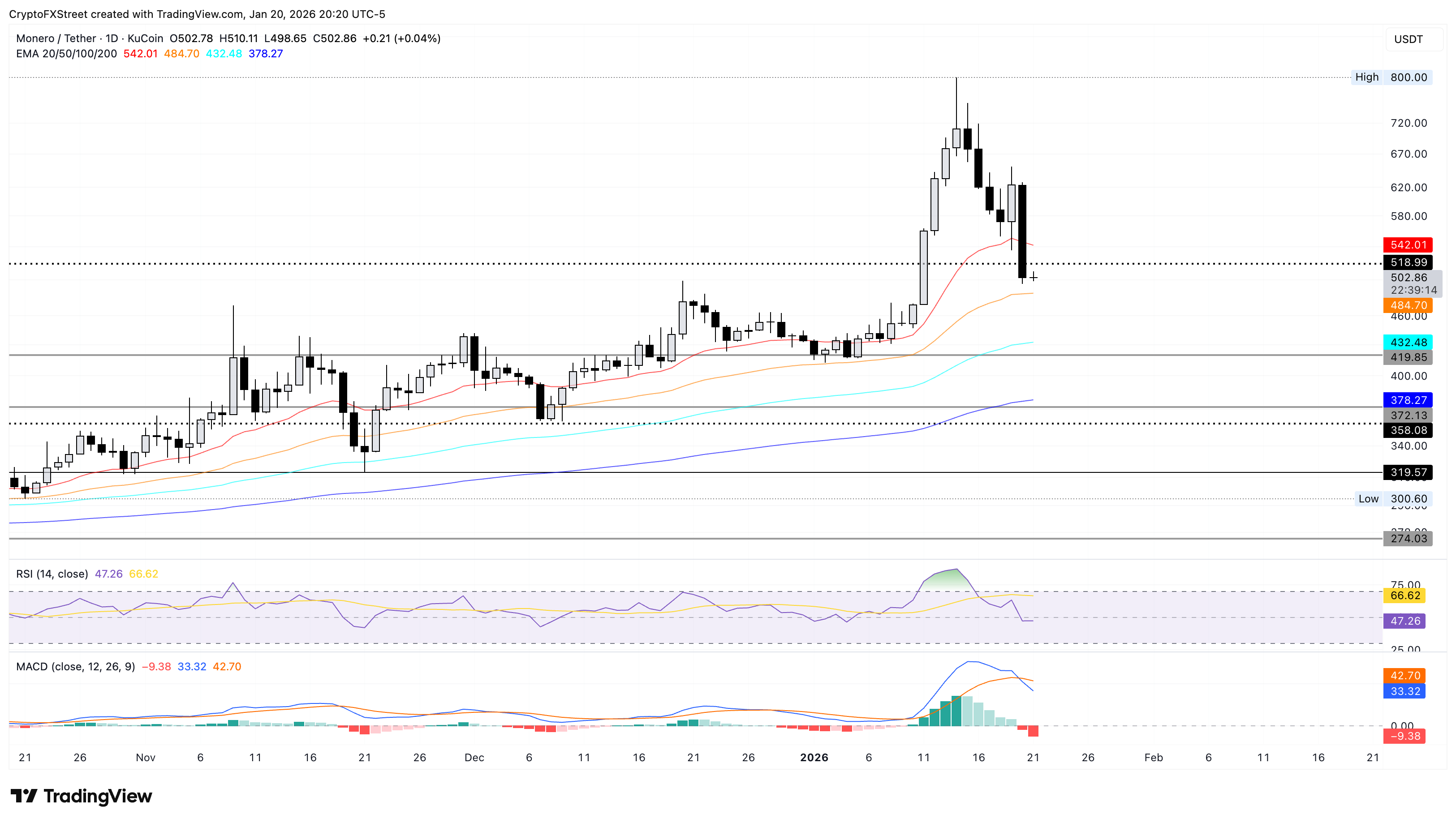 Monero, çarşamba günü basın zamanında 500$ civarında işlem görüyor, zira bu psikolojik destek seviyesi, önceki gün %20'lik bir düşüşün ardından aşağı yönlü hareketi sınırlıyor. Gizlilik parası, 484$'daki 50 günlük Üstel Hareketli Ortalama (EMA) ve 432$'daki 100 günlük EMA'da daha derin destek bulabilir, bu da daha geniş yükseliş eğilimini koruyor.