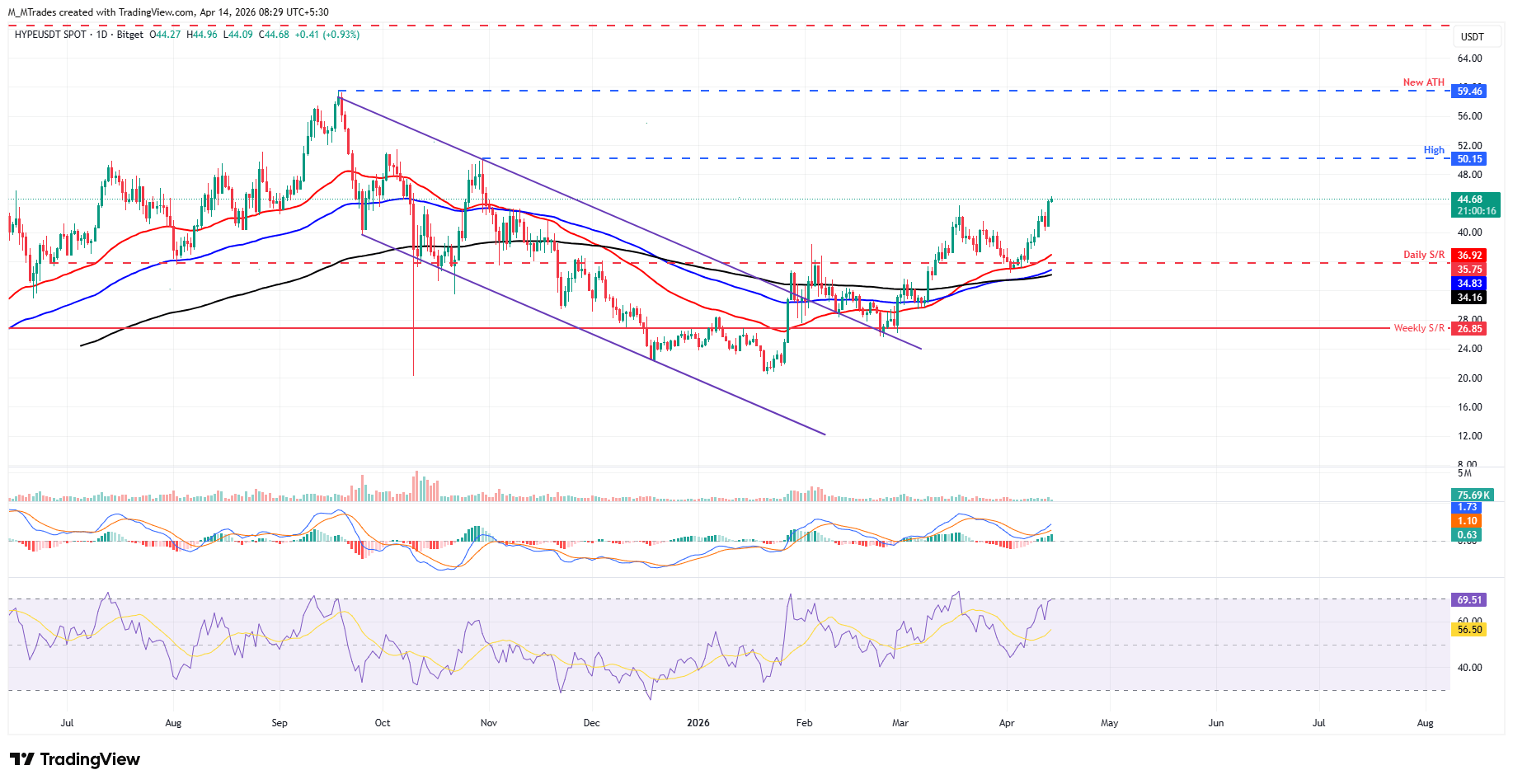 Hyperliquid fiyatı, salı günü %8,37 yükseldikten sonra 44$ üzerinde işlem görerek kazançlarını genişletiyor ve önceki gün 43,75$ olan mart ayı zirvesini geçti.