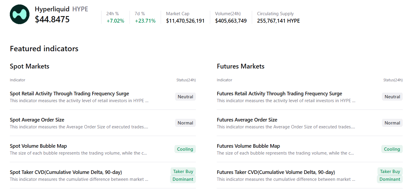 CryptoQuant özet verileri yükseliş eğilimini gösteriyor. Hyperliquid’in spot ve vadeli işlemler piyasaları alım tarafı hakimiyeti ve soğuma koşulları sergilerken, diğer metriklerde çoğunlukla nötr koşullar, potansiyel bir yukarı yönlü hareketi işaret ediyor.