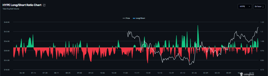 Ayrıca, CoinGlass’in salı günü için HYPE uzun-kısa oranı 1,04 olarak ölçüldü. Bu oranın birin üzerinde olması, piyasada yükseliş eğilimini yansıtır; çünkü daha fazla yatırımcı varlık fiyatının yükselmesini bekliyor.