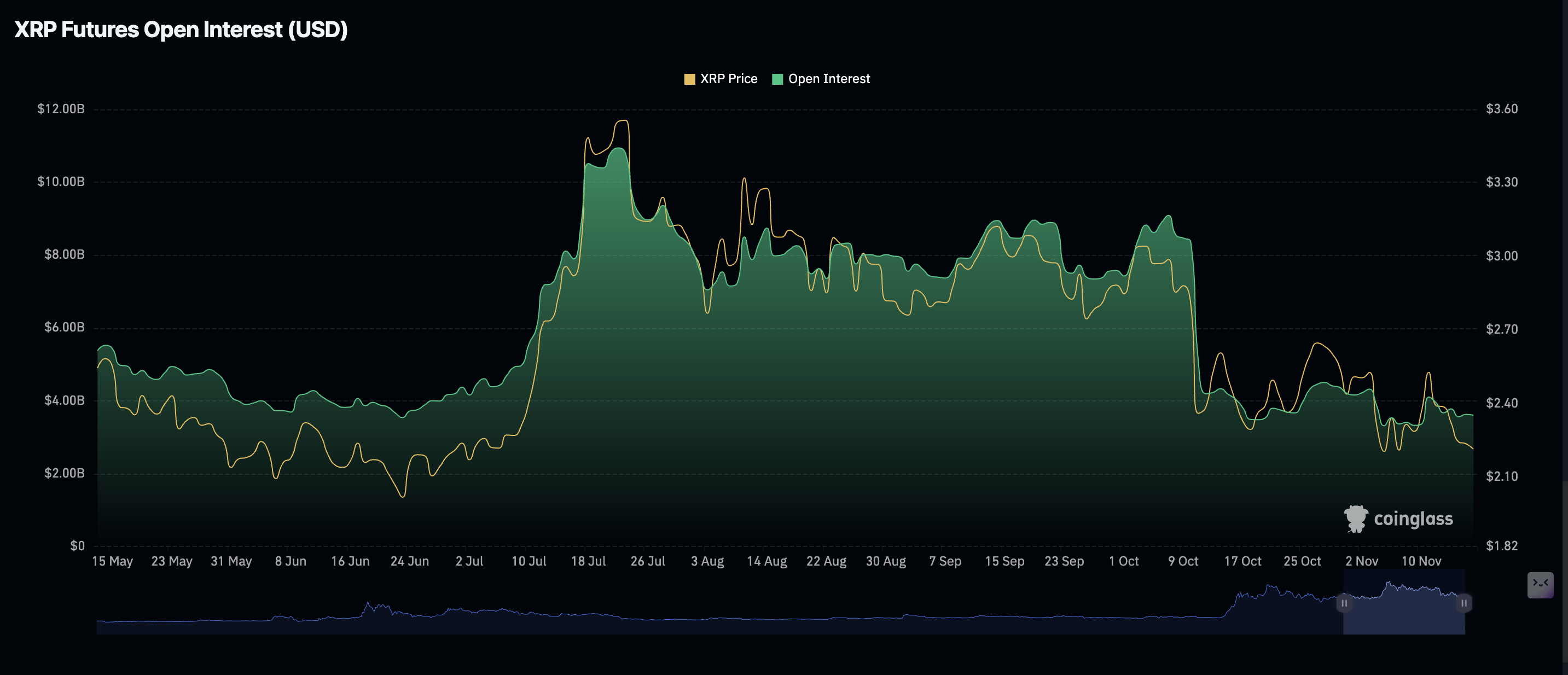 Öte yandan, XRP için perakende talep, ekim ortasından bu yana toparlanmadı ve zayıf bir türevler piyasası ile karakterize ediliyor. CoinGlass verileri, pazartesi günü vadeli işlemler Açık Pozisyon (OI) ortalamasının 3,61 milyar dolar olduğunu gösteriyor; bu, bir önceki gün 3,63 milyar dolardan hafif bir geri çekilme, ancak 22 Temmuz'da kaydedilen 10,94 milyar dolarlık rekor seviyeden önemli ölçüde düşük.