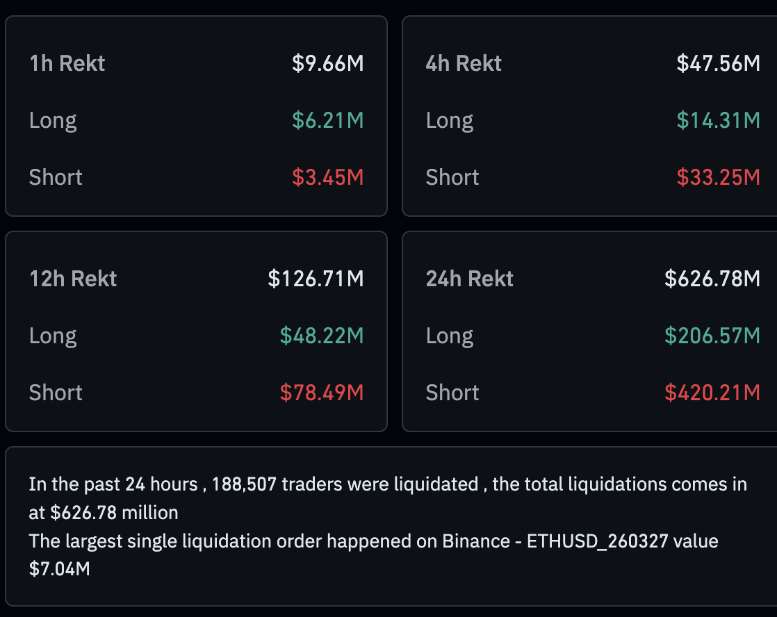 Fiyatlardaki artışla birlikte, türevler piyasası istikrar kazandı ve son 24 saatte likidasyonlar ortalama 627 milyon dolara ulaştı. Kısa pozisyonlarda yaklaşık 420 milyon dolar likidasyon gerçekleşirken, uzun pozisyonlarda bu rakam 206 milyon dolarda kaldı.