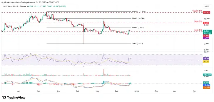 Uniswap (UNI) fiyatı, salı günü yazım sırasında 6$'ın üzerinde kalıyor ve bir önceki hafta kritik bir direnç bölgesinin üzerinde kapanış yaptı. Yatırımcılar, perşembe günü sonuçlanması beklenen ve kısa vadeli önemli bir katalizör olabilecek UNIfication önerisine odaklanıyor. Teknik tarafta, momentum göstergeleri yükseliş sinyalleri veriyor ve yukarı yönlü bir ralliyi işaret ediyor.
