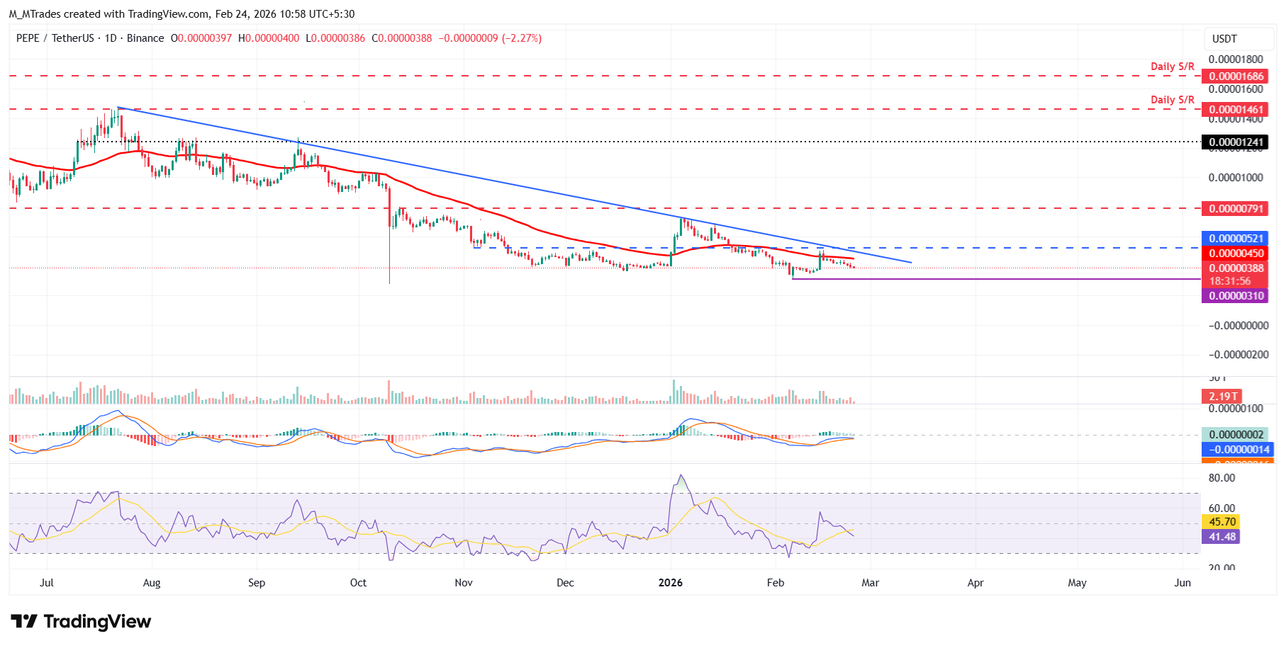 Dogecoin ve Shiba Inu gibi, PEPE momentum göstergeleri, RSI ve MACD de olumsuz görünümü destekliyor.