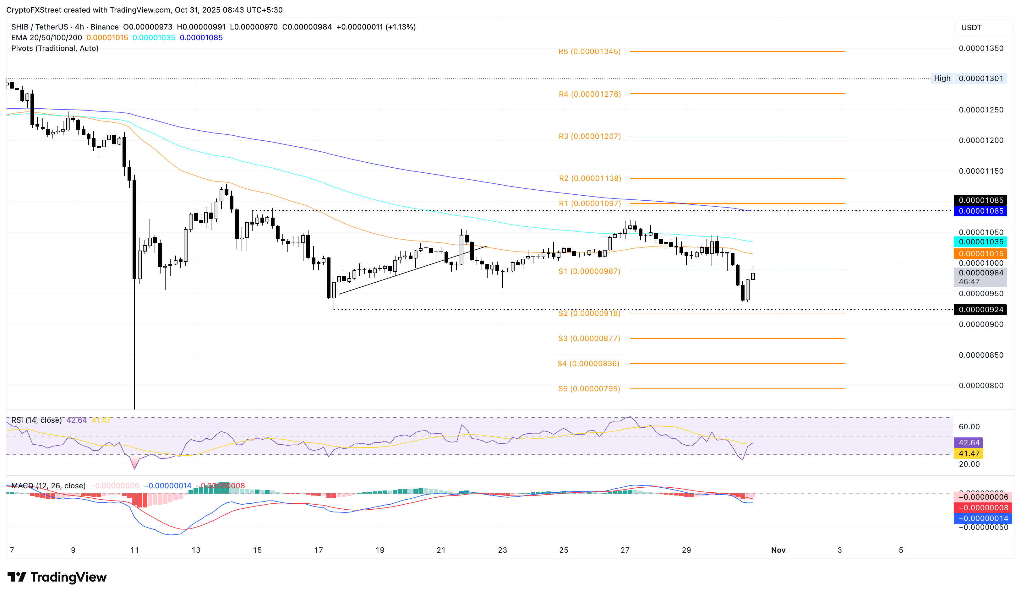 Meme coin, 17 Ekim'deki en düşük seviye olan 0,00000924 seviyesinin yakınından geri sıçradıktan sonra 0,00000987'deki S1 Pivot Noktası'nın üzerinde kalmakta zorlanıyor.