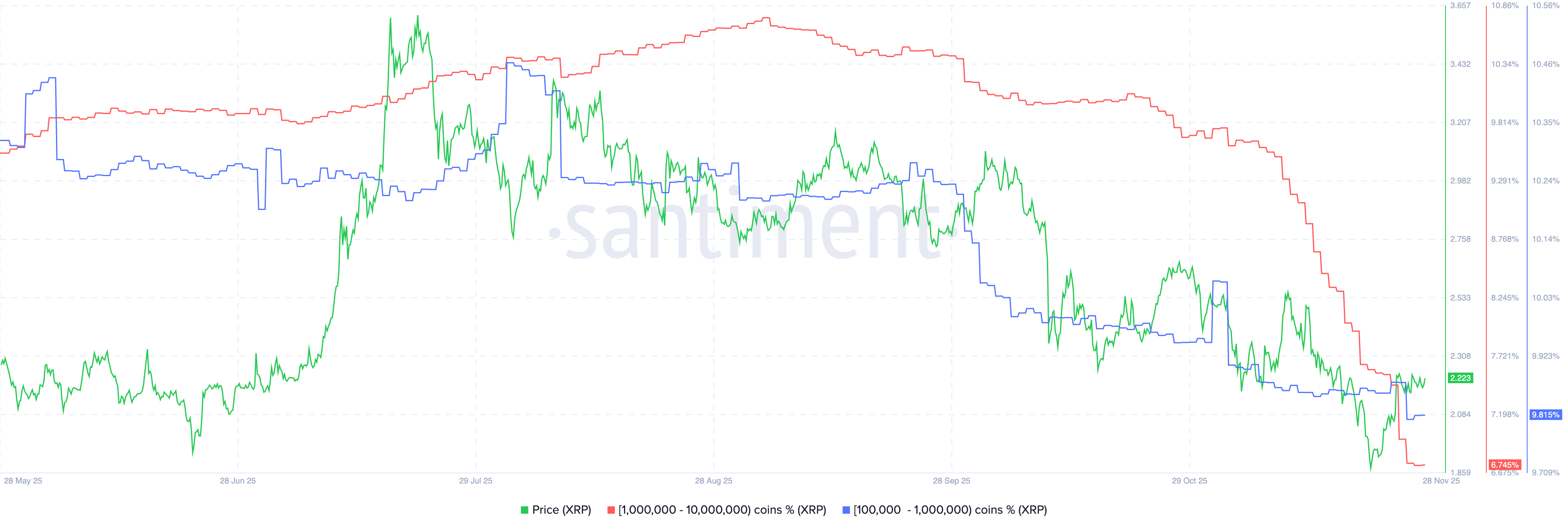 Sonuç olarak, 1 milyon ile 10 milyon token arasında tutan adresler (kırmızı çizgi) XRP’nin toplam arzının %6,75'ini oluşturuyor ve bu oran 1 Kasım'da %9,76 ve 4 Eylül'de %10,75'ti.