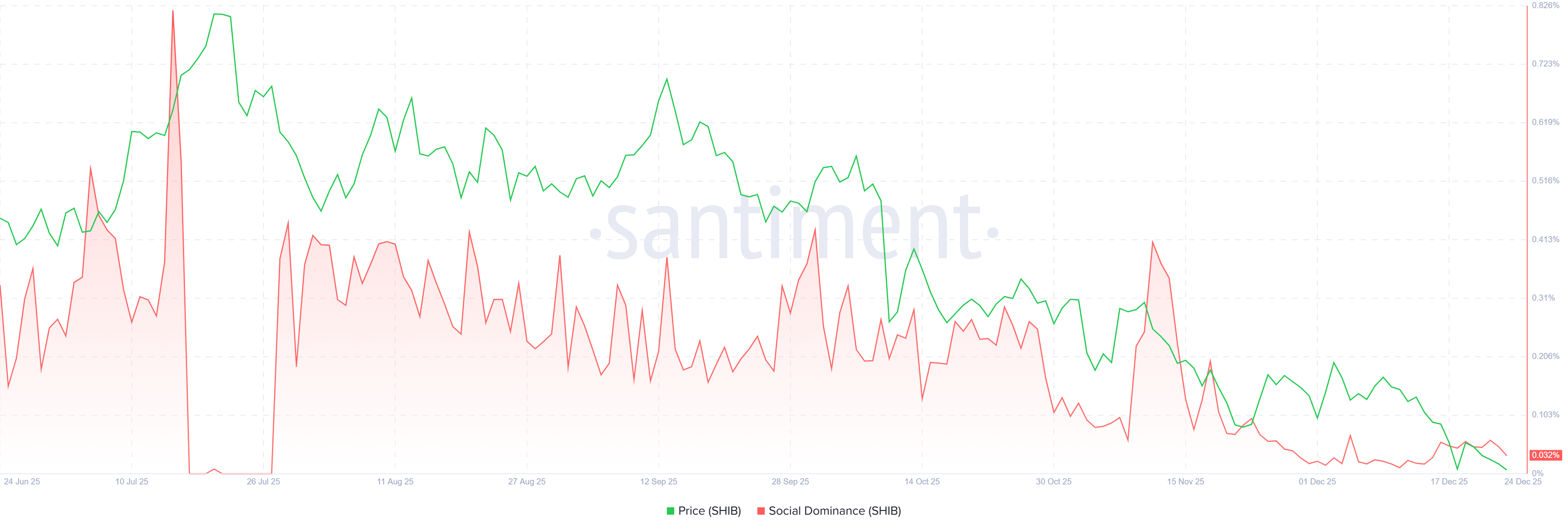 Santiment’in Shiba Inu için Sosyal Hakimiyet metriği, aşağı yönlü bir görünümü destekliyor. Endeks, kripto para medyasındaki SHIB ile ilgili tartışmaların payını ölçüyor. Kasım ortasından bu yana sürekli olarak azalmış ve çarşamba günü yıllık dip seviyelerine yakın %0,032'ye ulaşmıştır. Bu düşüş, piyasa ilgisinin azaldığını ve SHIB yatırımcıları arasında duyguların zayıfladığını gösteriyor.