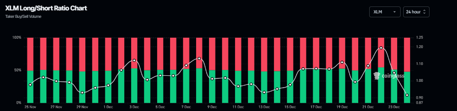 Ayrıca, Coinglass'ın XLM için uzun-kısa oranı çarşamba günü 0,91 olarak kaydedildi ve bu, bir ay içindeki en yüksek seviye. Birin altındaki oran, piyasada düşüş eğilimini gösteriyor, çünkü daha fazla yatırımcı XLM fiyatının düşeceğine bahis yapıyor.