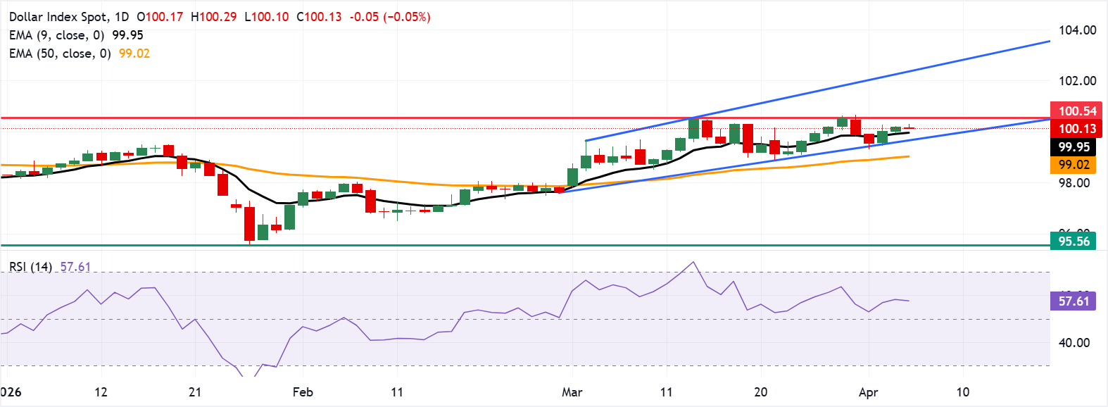 Aşağı yönde, birincil destek dokuz günlük EMA olan 99,95 seviyesinde, ardından yükselen kanalın alt sınırı olan yaklaşık 99,70 seviyesinde bulunuyor. Kanalın altına bir kırılma, ABD Dolar Endeksi üzerinde aşağı yönlü baskı oluşturacak ve 50 günlük EMA olan 99,02 seviyesinin test edilmesine neden olabilir.