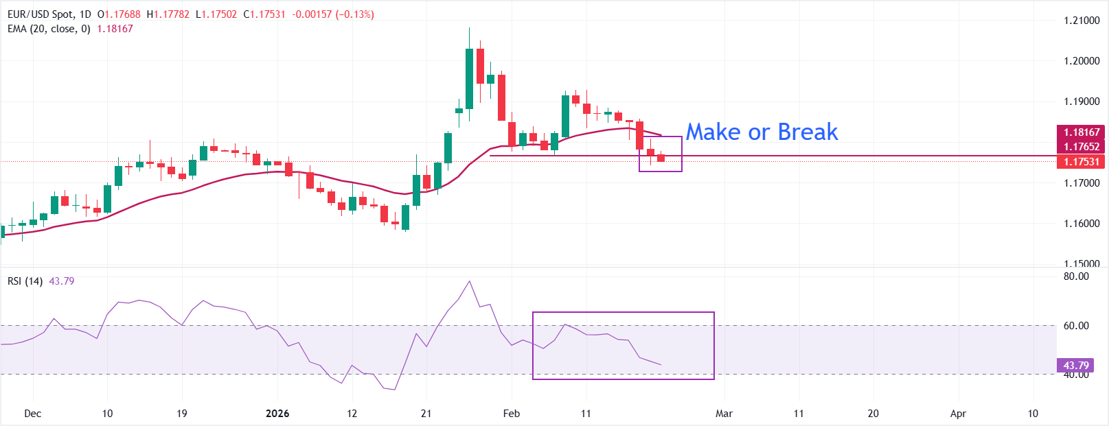 EUR/USD, son olarak %0,14 düşüşle 1,1755 civarında işlem görüyor. Ana döviz çifti, perşembe günü 1,1742'de yeni bir dip seviyesi kaydederek düşüş trendinin başladığını gösteriyor. Ayrıca, parite 1,1817'deki 20 günlük Üstel Hareketli Ortalama'nın (EMA) altında kalıyor ve bu da kısa vadeli bir düşüş trendine işaret ediyor. 20 günlük EMA, aşağı doğru kayıyor ve kısa vadeli direnç işlevi görüyor.