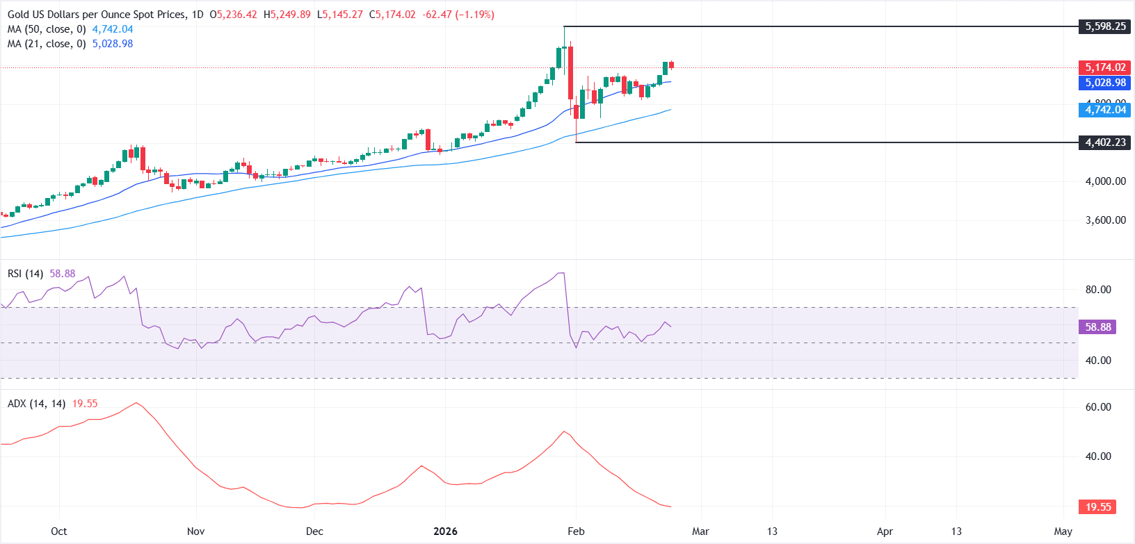 Teknik açıdan, XAU/USD'nin görünümü 5.100$ bariyerinin üzerindeki kırılmanın ardından olumlu bir hale geldi. Günlük grafikte, kısa vadeli eğilim hafif yükseliş yönünde kalmaya devam ediyor, fiyatlar yükselen 21 günlük ve 50 günlük Basit Hareketli Ortalamaların (SMA) üzerinde rahatça tutunuyor ve her ikisi de yukarı yönlü eğilimi sürdürüyor, son dönem volatilitesine rağmen.
