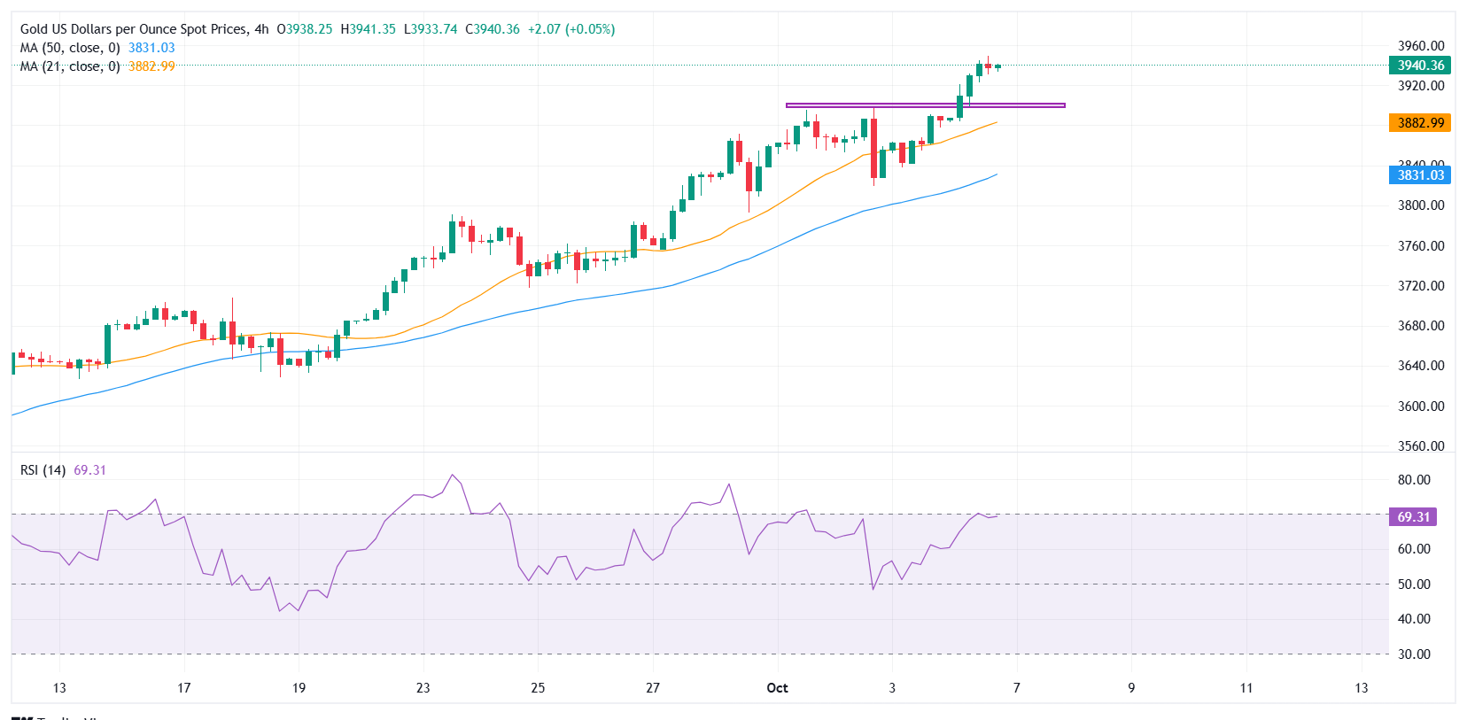Bu satırların yazıldığı sırada, XAU/USD 3.930$ civarında işlem görüyor ve gün içinde yaklaşık %1,10 artışla, Avrupa seansında daha önce 3.949$'lık yeni bir tüm zamanların en yüksek seviyesini kısa bir süre için gördükten sonra sağlam bir şekilde duruyor ve kazanç serisini sekizinci haftaya taşıyor.