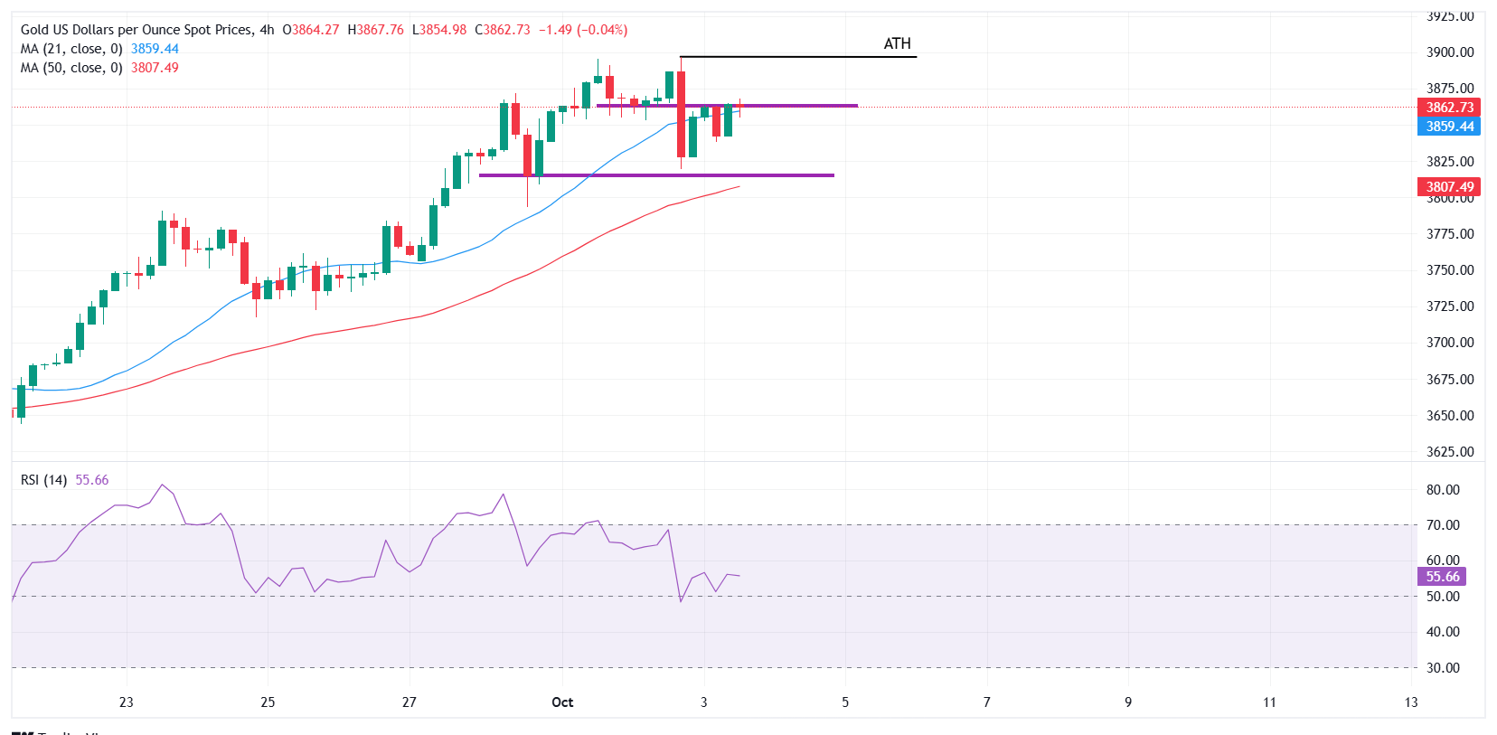 XAU/USD, Perşembe günkü dalgalı hareketlerin ardından dip alıcılarının geri çekilmelerde ortaya çıkmasıyla istikrar kazanıyor. 3.860-3.865$ aralığı, fiyatın 4 saatlik grafikte 3.859$ civarında 21 dönemlik Basit Hareketli Ortalama (SMA) etrafında test edilmesiyle yakın vadeli hemen direnç olarak işlev görüyor.