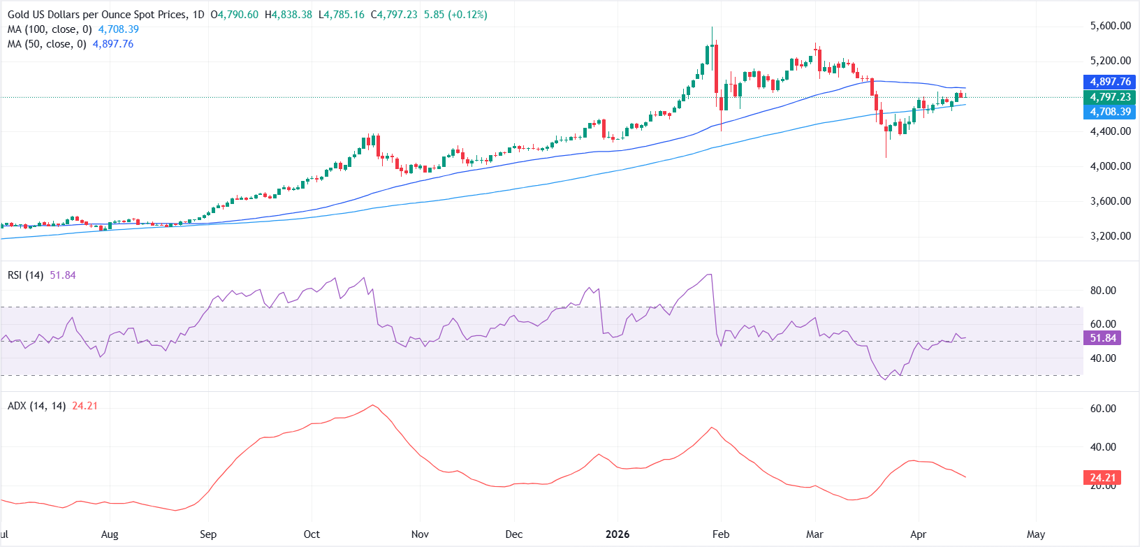 Teknik açıdan bakıldığında, günlük grafik metalin şu anda yaklaşık 4.897 $ civarında bulunan 50 günlük Basit Hareketli Ortalama (SMA) altında baskı altında kaldığını gösteriyor; bu seviye acil bir yukarı direnç görevi görüyor. Bu arada, yaklaşık 4.708 $ civarındaki 100 günlük SMA acil destek sağlıyor ve fiyat hareketini yatayda tutuyor.
