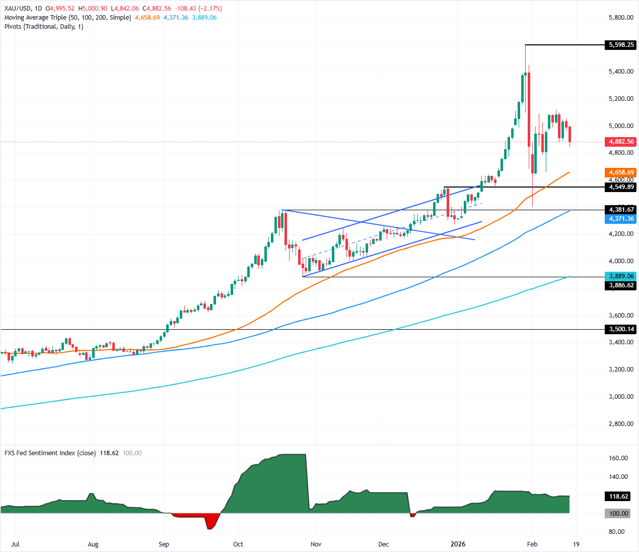 XAU/USD Teknik görünüm: 5.000$'da mücadele ediyor, 4.900$'ın altına düşüyor