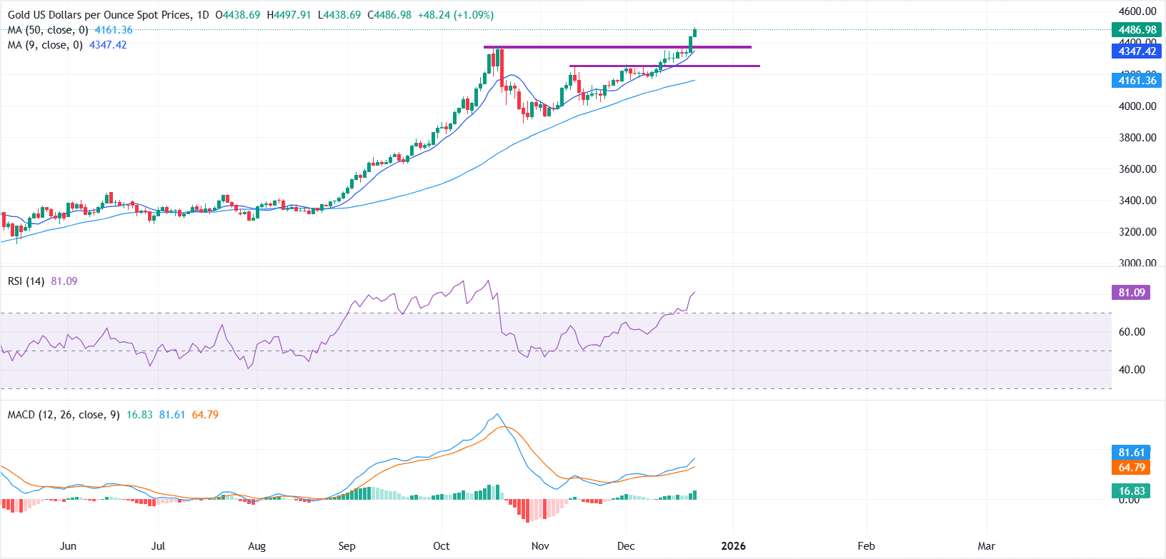 Son yükseliş, piyasaların uzun tatil dönemine girmesiyle yıl sonu yeniden pozisyon alma hareketini de yansıtıyor. Yüksek seviyelerde bazı kar alımları kısa vadeli bir konsolidasyonu tetikleyebilirken, daha geniş trend yapıcı kalmaya devam ediyor ve Altın, yıl başından bu yana neredeyse %70 artışla 1979'dan bu yana en güçlü yıllık performansına doğru ilerliyor.