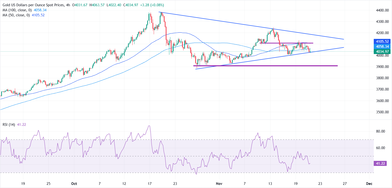 4 saatlik grafikte, XAU/USD baskı altında kalmaya devam ediyor; fiyat, hem 50 dönemlik hem de 100 dönemlik Basit Hareketli Ortalamaların (SMA) altında işlem görüyor ve kısa vadeli tonun satıcılara doğru eğilimli kalmasını sağlıyor. 50 dönemlik SMA, yaklaşık 4.105,62$ seviyesinde, zayıflayan yükseliş momentumunu işaret ederek aşağı doğru kaymaya başladı; bu, hala 4.058,39$ civarında hafif yükselen 100 dönemlik SMA'nın hemen üzerinde yer alıyor.