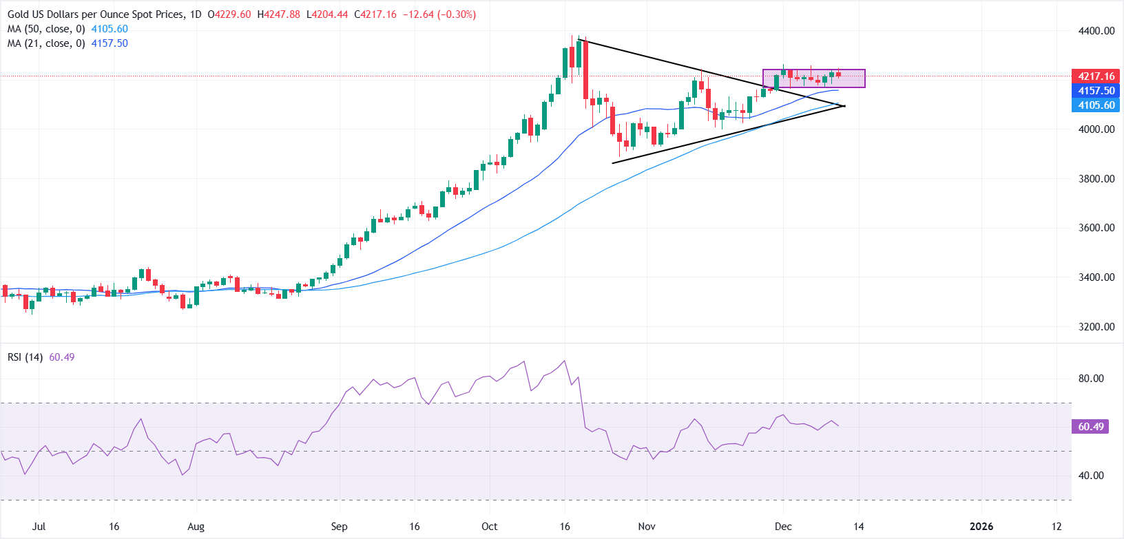 Ons Altın fiyatı (XAU/USD), yatırımcıların Federal Rezerv'in (Fed) para politikası görünümünü son faiz indiriminden sonra yeniden değerlendirmesiyle perşembe günü hafifçe geriliyor. Bu satırların yazıldığı sırada, metal 4.217$ civarında işlem görüyor ve gün içinde kısa bir süre 4.250$'a yükseldikten sonra Fed sonrası yükselişinin bir kısmını geri veriyor.