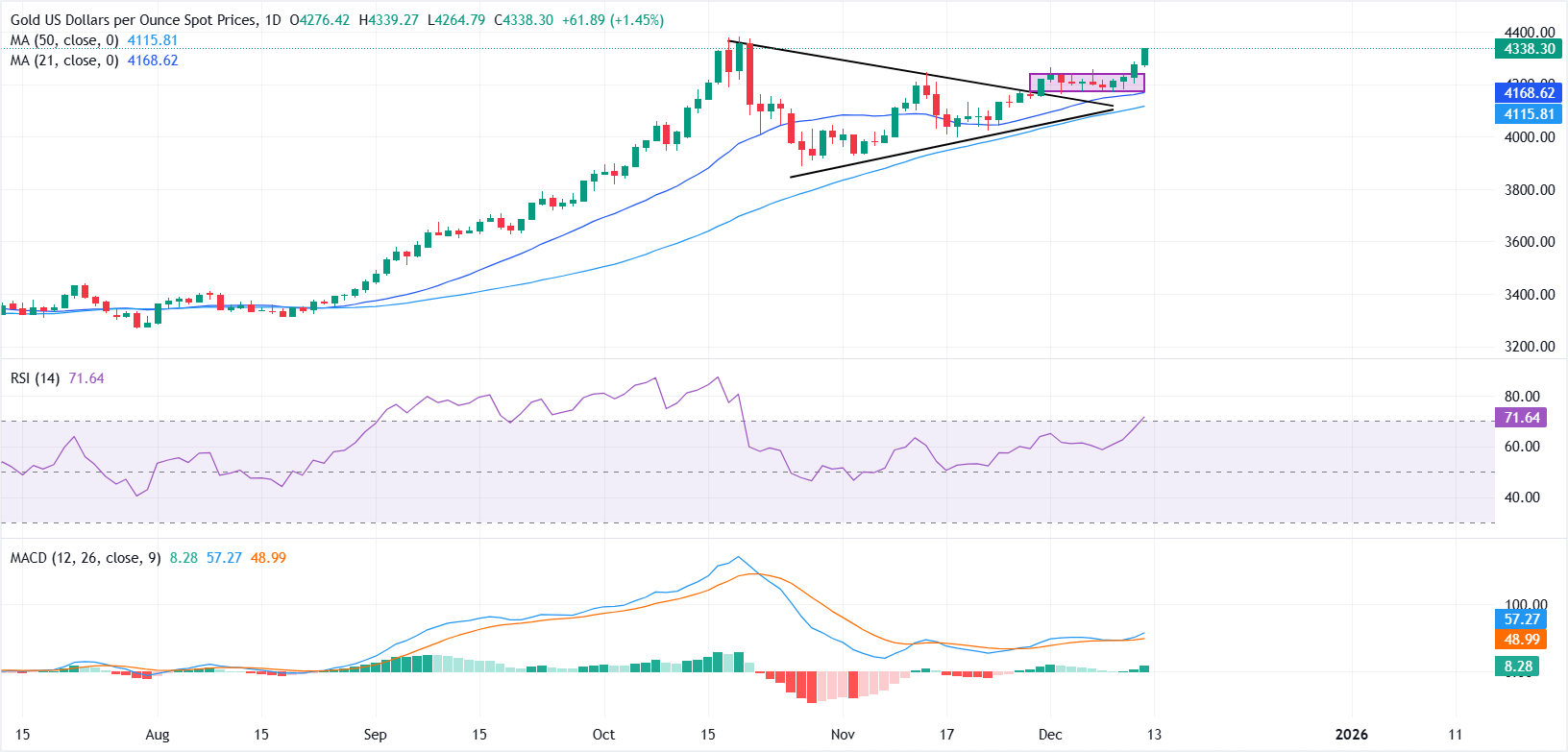 Son yükseliş, piyasalardaki Fed'in 2026'ya kadar olan politika yolunu yeniden değerlendirmesiyle iki haftalık konsolidasyon aralığından çıkmasına yardımcı oldu. Duygu değişikliği, çarşamba günü borçlanma maliyetlerini 25 baz puan (bps) düşürme kararının ardından geldi ve bu yılki üçüncü faiz indirimini işaret etti.
