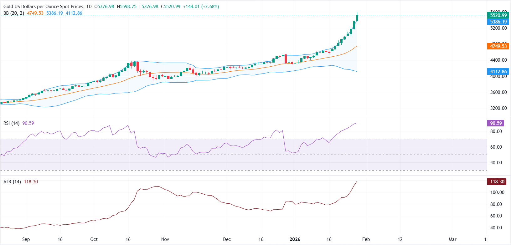 Altın'ın yükselişi giderek daha fazla gerilmiş durumda, ancak boğalar güçlü yukarı yönlü momentum devam ettiği için etkilenmiş görünmüyor. Günlük grafikte, Bollinger Bantları genişliyor ve fiyat, 5.384$ civarında üst bandın oldukça üzerinde işlem görüyor; bu da hem güçlü bir yükseliş momentumunu hem de gerilmiş koşulları vurguluyor.