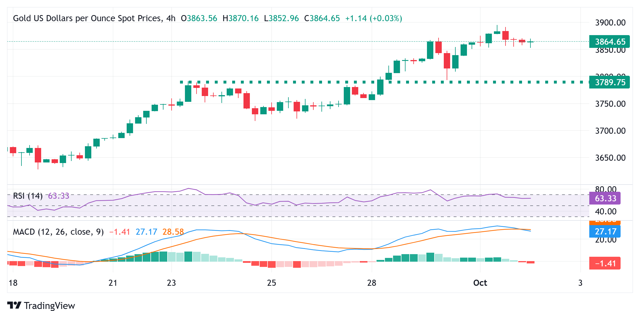 Altın, perşembe günü erken saatlerde 3.895$'lık tarihi zirvelerden önceki geri çekilmesini sürdürüyor; ABD Doları ise ABD hükümetinin kapanma endişeleriyle gece işlemleri sırasında kaydettiği toparlanmada zorlanıyor. Teknik olarak, Altın 'dip al' ticareti olarak kalmaya devam ediyor ve dört saatlik RSI yükseliş bölgesinde bulunuyor.