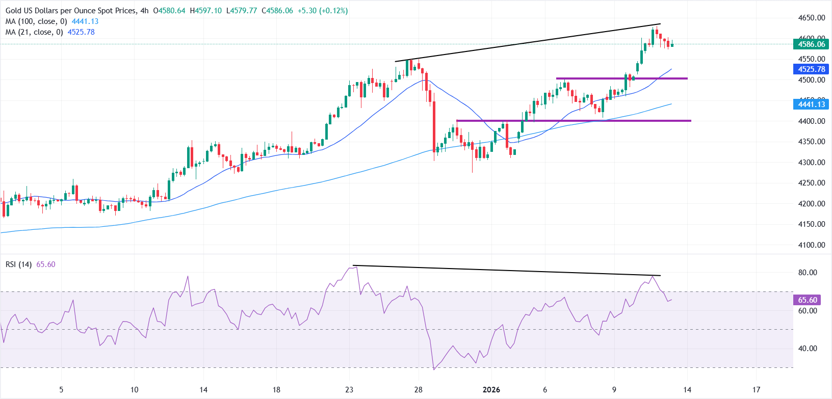 Altın fiyatları salı günü mütevazı kazançlarla işlem görüyor, son zamanların tarihi zirvesinden çok uzakta değil. XAU/USD paritesi, ABD enflasyon verilerinin açıklanmasının ardından kısa bir süreliğine 4.600$'ı aştıktan sonra geri döndü.
