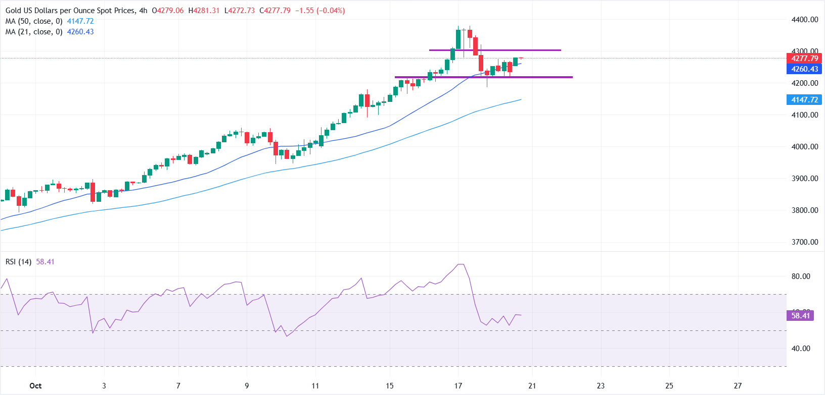 XAU/USD, tarihi zirvelerden cuma günkü keskin geri çekilmenin ardından istikrar kazanıyor ve 4.380$ civarındaki tüm zamanların en yüksek seviyesinin yakınında potansiyel kısa vadeli bir zirve öneriyor. 4 saatlik grafikte, spot fiyatlar 4.256$'daki 21 dönemlik Basit Hareketli Ortalama (SMA) üzerinde seyrediyor.