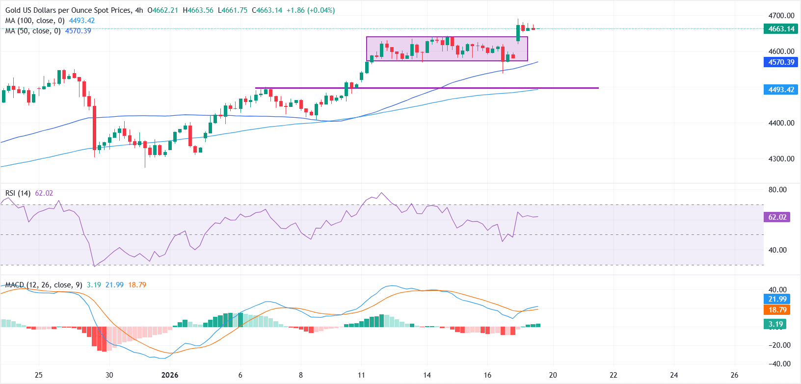 Bu satırların yazıldığı sırada, XAU/USD 4.663$ civarında işlem görüyor, 4.690$ civarındaki yeni tüm zamanların zirvesinin hemen altında konsolide oluyor ve gün için neredeyse %1,75 artış gösteriyor.