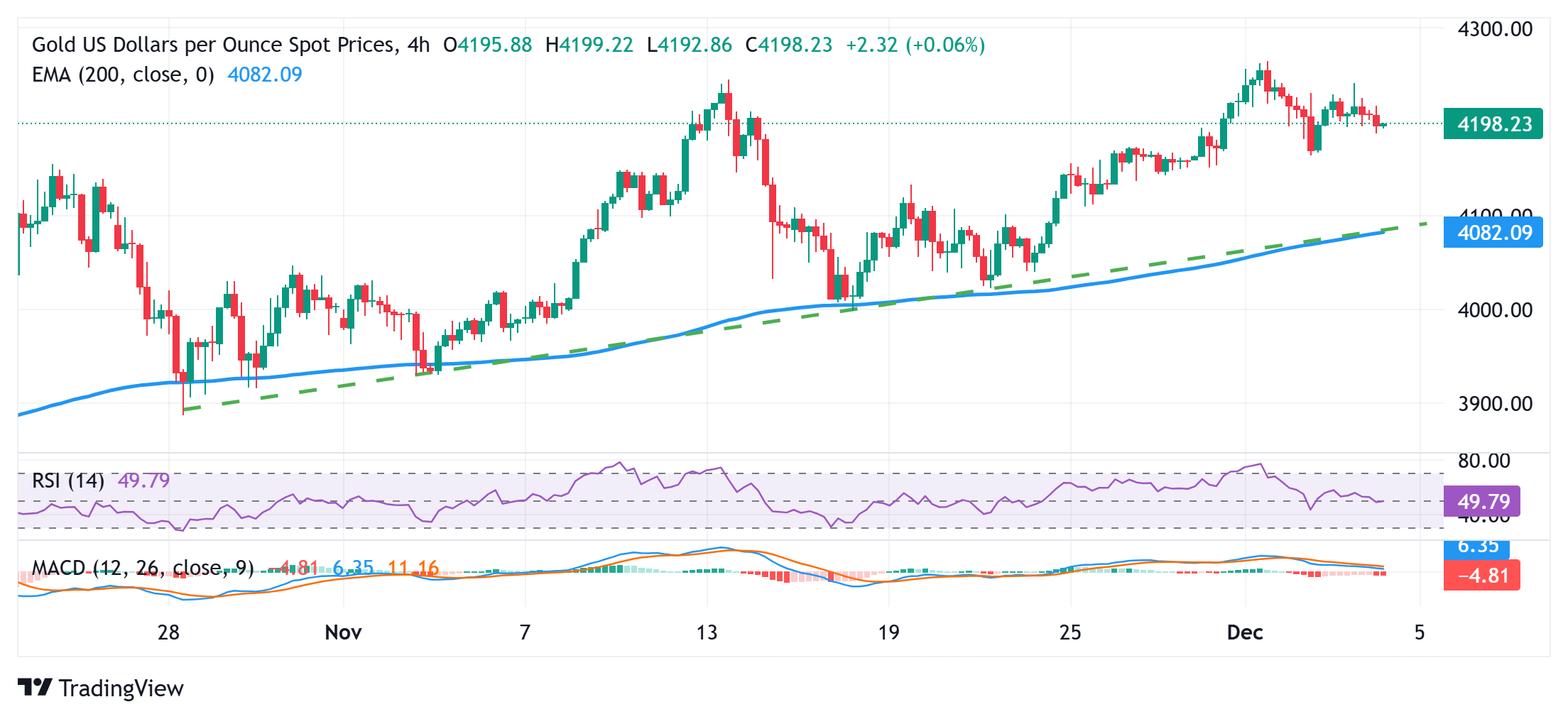 Altın, Aralık ayı para politikası toplantısının ötesinde ABD Merkez Bankası'nın faiz oranı görünümüne dair yeni ipuçları için daha fazla ABD istihdam verisini beklerken, 4.200 dolar civarında tanıdık bir aralıkta dalgalanarak yukarı yönlü konsolidasyon aşamasına girdi