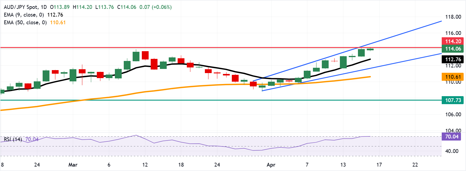 AUD/JPY, 6 Nisan'da başlayan kazanç serisini perşembe günü Avrupa saatlerinde 114,10 civarında işlem görerek sürdürüyor. Günlük grafiğin teknik analizi, para birimi çiftinin yükselen kanal formasyonu içinde yukarı yönlü hareket etmesi nedeniyle yükseliş eğilimi olduğunu gösteriyor.