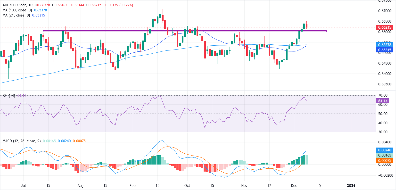Bu seviyenin üzerinde kalmak, yükseliş tonunu pekiştiriyor ve bu yılın zirvesi olan 0,6707'yi yeniden test etme olasılığını açık tutuyor; bu seviye 17 Eylül'de belirlenmiş olup, yılın en yüksek seviyesi ve Ekim 2024'ten bu yana en güçlü seviye olarak duruyor.