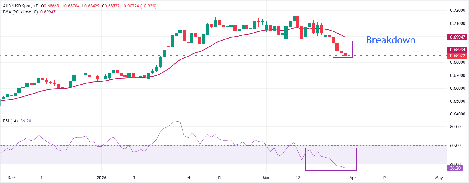 AUD/USD on haftanın en düşük seviyelerinden uzaklaşsa da pazartesi günü Asya işlemlerinde 0,6850 civarında aşağı yönlü eğilimini koruyor. Risk duyarlı parite, Orta Doğu savaşının genişlemesiyle birlikte kalıcı güvenli liman talebi nedeniyle baskı altında kalmaya devam ediyor ve müzakere edilen bir ateşkes belirtisi görünmüyor.