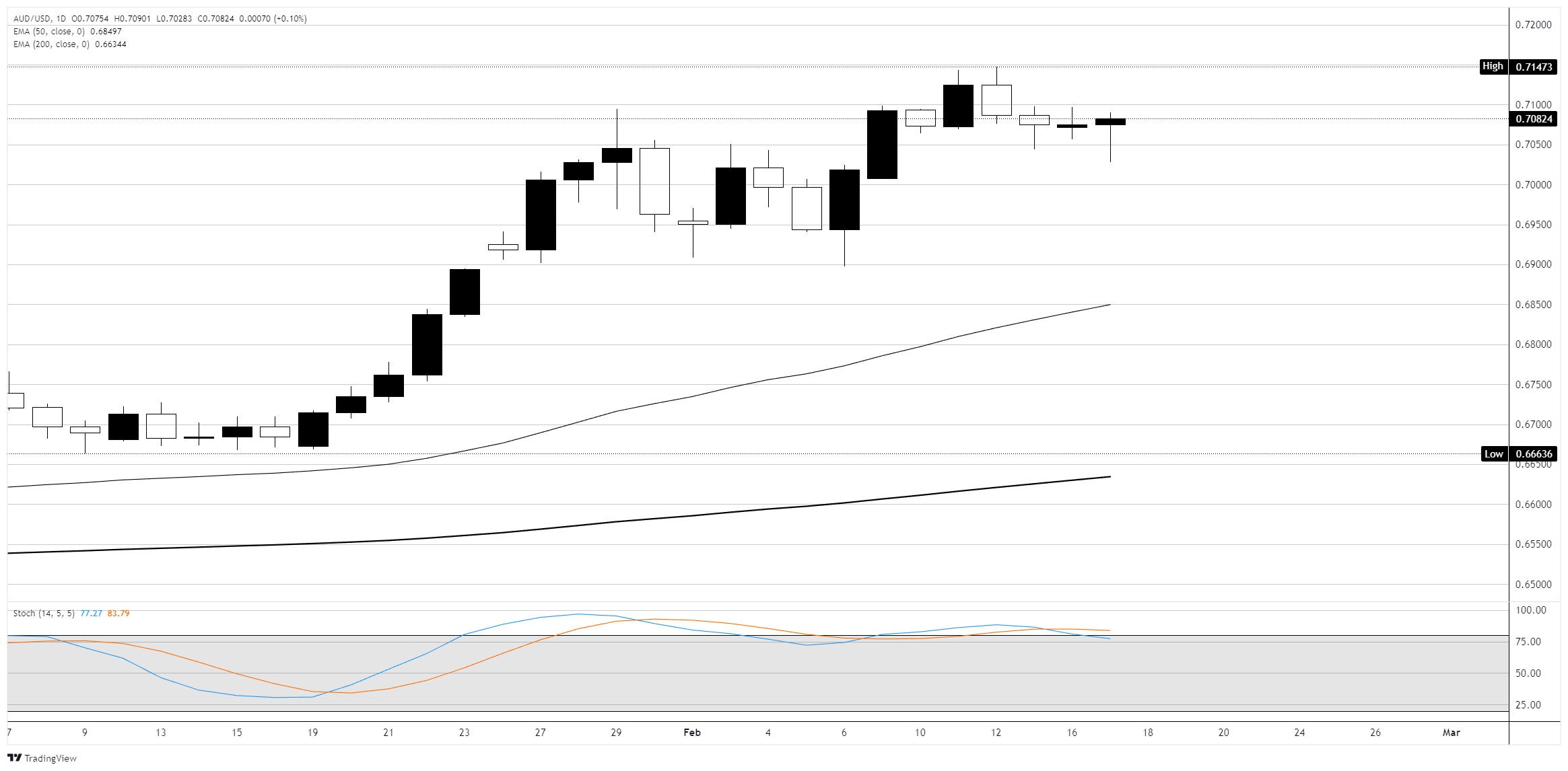 Geçtiğimiz hafta boyunca mum yapısı, 0,7080 ile 0,7100 bölgesinde bir dizi küçük gövdeye sahip mum ve doji gösteriyor; bu da 12 Şubat'taki 0,71473 zirvesinin ardından kararsızlık ve konsolidasyonu işaret ediyor. Acil destek, Salı gününün dip seviyesi olan 0,70283'te bulunuyor; bunu 0,7000 psikolojik seviyesi takip ediyor. 0,7000'in altına bir kırılma, 0,6940 ile 0,6960 arasındaki geç dönem Ocak sıkışma bölgesine kapı açar. Yukarıda, direnç 0,7100 tutamacında ve 0,71473 yılın en yüksek seviyesinde; bu seviyenin üzerinde günlük kapanış, 0,7200 bölgesini hedefleyecektir. Fiyat ile 50 günlük EMA arasındaki geniş fark (230 pip'ten fazla), paritenin uzatıldığını gösteriyor ve 0,7000 bölgesine doğru daha fazla konsolidasyon veya geri çekilme, bir sonraki yukarı hareketten önce sağlıklı bir düzeltme olacaktır.