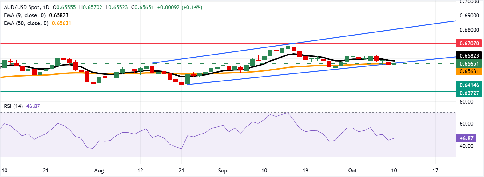 AUD/USD paritesi Cuma günü 0,6570 civarında işlem görüyor. Günlük zaman dilimindeki teknik analiz, paritenin yükselen kanala doğru geri döndüğünü ve yükseliş eğiliminin canlandığını gösteriyor. Ancak, 14 günlük Göreceli Güç Endeksi (RSI) 50 seviyesinin altında kalmaya devam ediyor ve bu da bir düşüş eğiliminin etkili olduğunu gösteriyor.