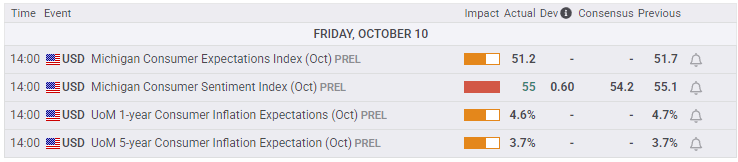 Tüketici Güven Endeksi, Michigan Üniversitesi'nden (UoM) Ekim ayı için beklenenden daha az bir düşüş gösterdi ve çok daha kötü bir sonuç bekleyen yatırımcılara küçük bir destek sağladı. UoM 1 yıllık Tüketici Enflasyon Beklentileri de %4,7'den %4,6'ya geriledi, ancak 5 yıllık bileşen %3,7 seviyesinde yüksek kalmaya devam ediyor.