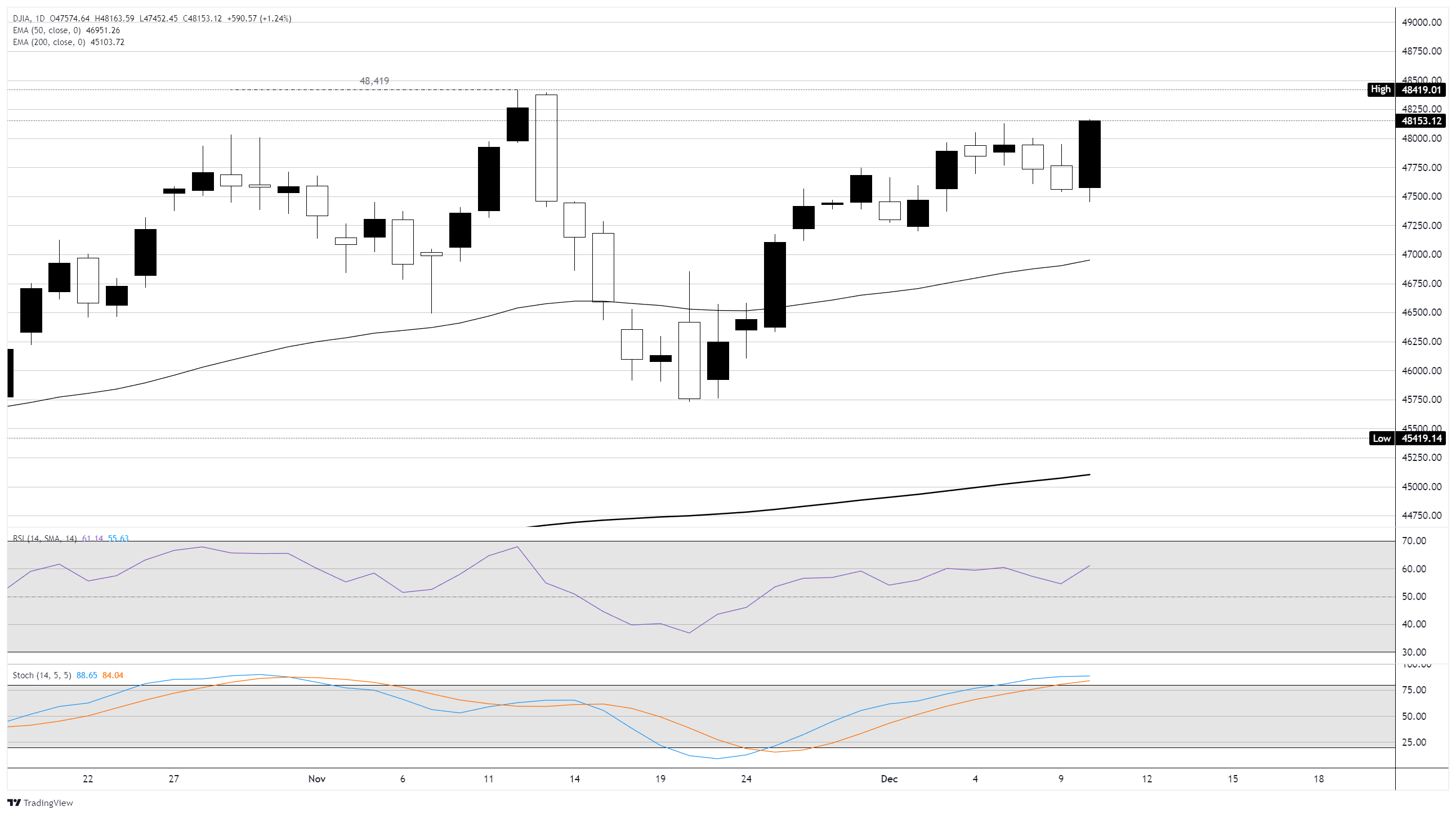 - Dow Jones, Fed'in üst üste üçüncü kez faiz indirimini açıklamasının ardından çarşamba günü %1,2'den fazla yükseldi.