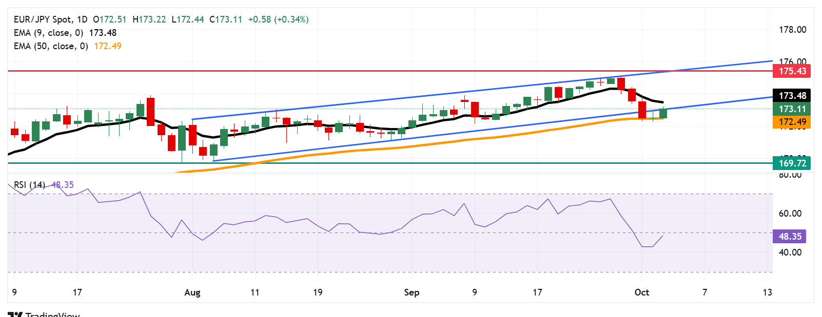 EUR/JPY, nötr bir günün ardından, cuma günü Asya saatlerinde 173,10 civarında işlem görerek değer kazandı. Günlük grafiğin teknik analizi, döviz çaprazının yükselen kanal formasyonuna doğru toparlanmasıyla birlikte yükseliş eğiliminin yeniden canlandığını gösteriyor.