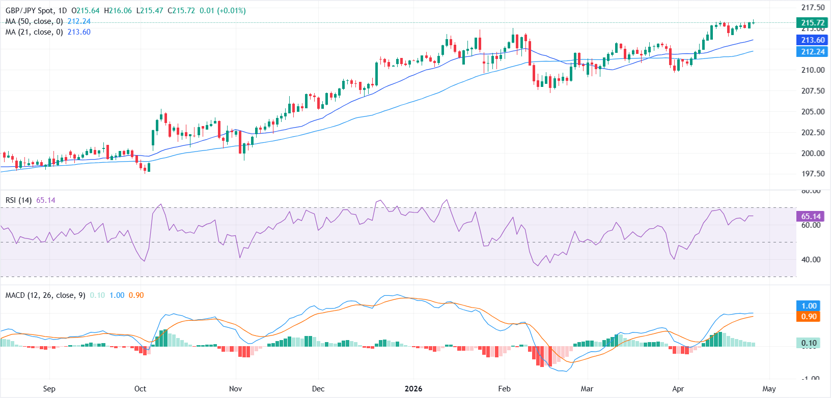 Günlük grafikte, GBP/JPY, 213,60 seviyesindeki 21 günlük basit hareketli ortalamanın (SMA) ve 212,24 seviyesindeki 50 günlük SMA'nın üzerinde iyi tutunarak kısa vadede yükseliş eğilimini koruyor. Yaklaşık 65 seviyesindeki pozitif ancak yumuşayan Göreceli Güç Endeksi (RSI) ve hala pozitif olan Hareketli Ortalama Yakınsama Iraksama (MACD) histogramı, yukarı yönlü momentumun devam ettiğine işaret ediyor; ancak parite, son zirveler civarında konsolide olurken yükseliş hızı biraz yavaşlıyor.