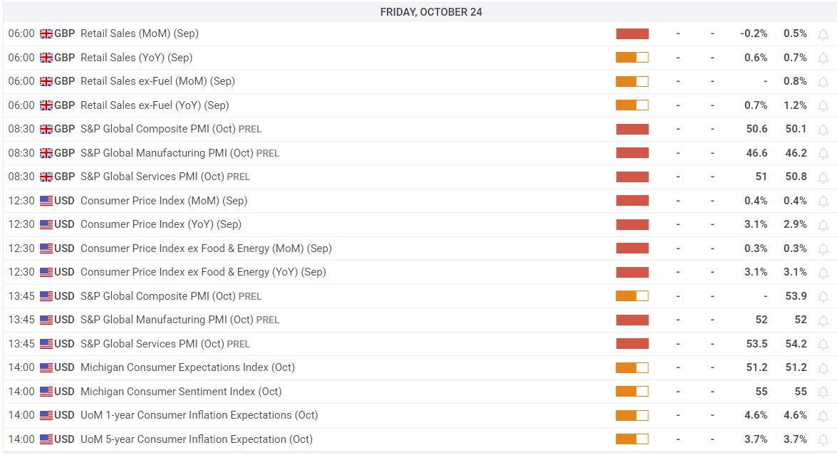 Perşembe günü ekonomik veri gündeminde bir duraklamanın ardından, etkili veri açıklamaları Cuma günü devam edecek. Cuma günü Londra piyasa seansında, Eylül ayına ait İngiltere Perakende Satışlar ve S&P Global Satın Alma Yöneticileri Endeksi (PMI) verileri açıklanacak. ABD enflasyon verileri ise ticaret haftasını kapatacak ve ABD Tüketici Fiyat Endeksi (TÜFE) enflasyonu, 29 Ekim'de Federal Rezerv'in (Fed) bir sonraki faiz kararı için toplanmadan önceki son önemli enflasyon verilerinden biri olacak.