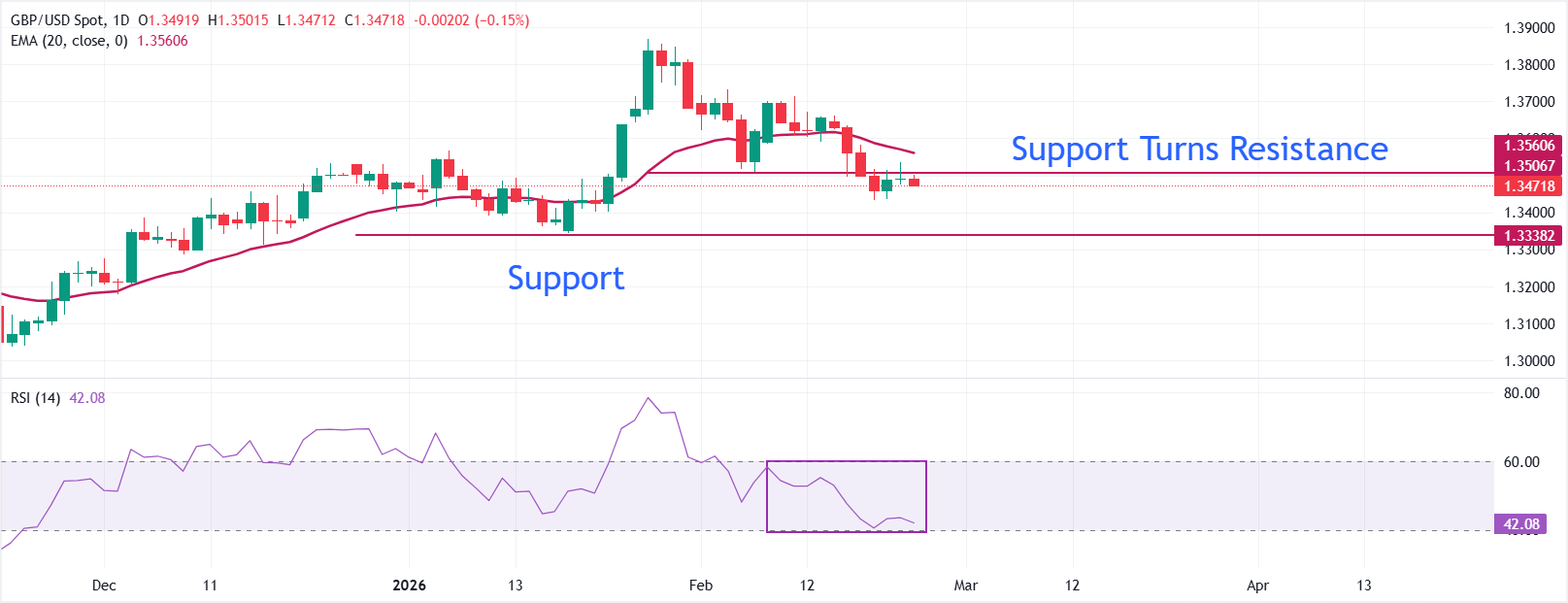 20 günlük Üstel Hareketli Ortalama (EMA) aşağı doğru eğim gösteriyor ve 1,3561 seviyesinde üstte yer alıyor, toparlanmaları sınırlıyor ve kısa vadeli yumuşak bir ton sağlıyor. Fiyatın 19 Şubat'taki 1,3434 seviyesinin altında kapanması durumu, 19 Ocak'taki 1,3344 seviyesine karşı savunmasız hale getirebilir.