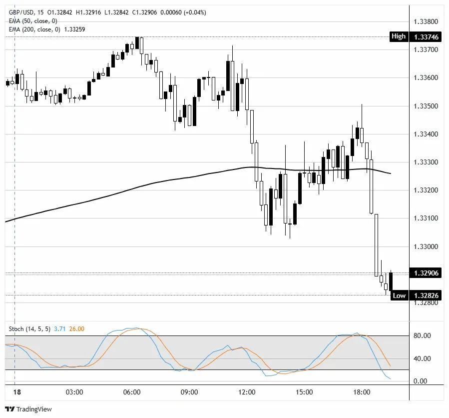 15 dakikalık grafikte, GBP/USD 1,3290 seviyesinden işlem görüyor. Kısa vadeli eğilim hafif düşüş yönlü, çünkü fiyat 1,3326 civarındaki 200 dönemlik üstel hareketli ortalamanın altında kalıyor ve ortalama düzleşiyor ve daha önceki konsolidasyonun ardından dinamik bir engel olarak işlev görüyor. En son Stokastik okuması tek hanelere düştü ve seansın başındaki aşırı alım koşullarını sürdüremediği için güçlü bir aşağı yönlü momentum onaylandı, bu da satış baskısını artırırken kısa vadeli aşırı satım durumuna da dikkat çekiyor.