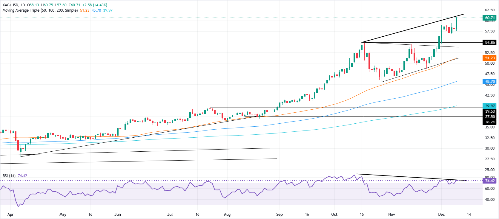 Gümüş (XAG/USD) fiyatı salı günü kazançlarını artırdı ve daha önce ulaştığı 60,57$'lık tarihi zirvesini yenileyerek, gün içinde %4'ten fazla kazanç sağladı ve şu ana kadar yıl başından bu yana %110 artış gösterdi. Bu satırların yazıldığı sırada, XAG/USD 60,75$'a ulaşarak şu anki gri metal için rekor seviye olan 60,65$'dan işlem görüyor.